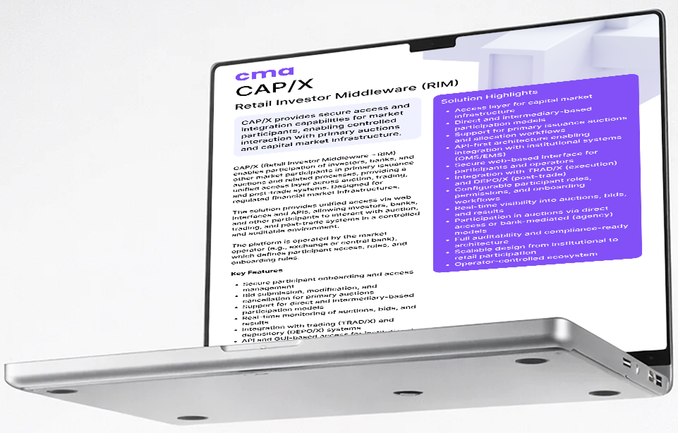 CAP/X is a secure access and integration layer designed to enable participation of market participants in primary issuance auctions and capital market infrastructure.